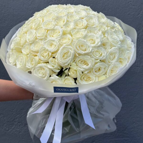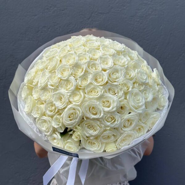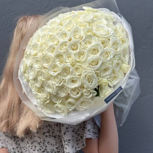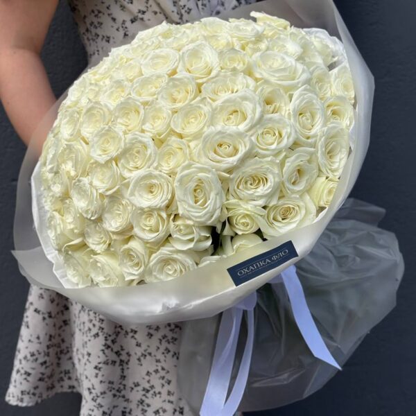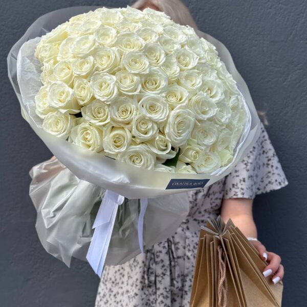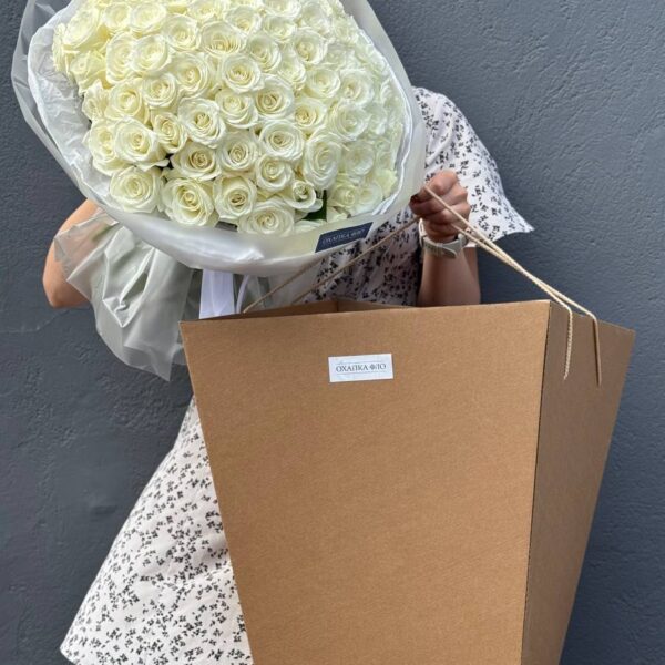 Элегантный букет из 101 белой розы в стильной сумке-переноске с удобной одноразовой бумажной вазой. Идеальный подарок для любого случая, сочетающий стиль, удобство и заботу о природе.